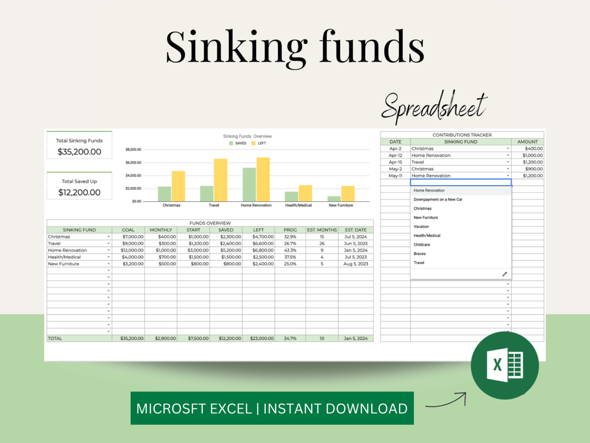 Manage your savings effortlessly with our Sinking Funds Tracker! This invaluable tool is designed to help you allocate funds for future expenses, ensuring you’re financially prepared for upcoming costs.